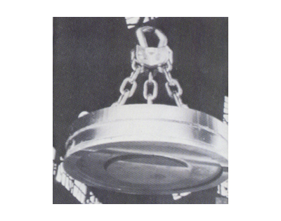 用于吊運(yùn)大型鋼錠、連鑄板、厚鋼板坯、吊運(yùn)長度6m以上的板坯時(shí)為了避免偏心而產(chǎn)生傾斜,請使用兩臺電磁鐵起吊。